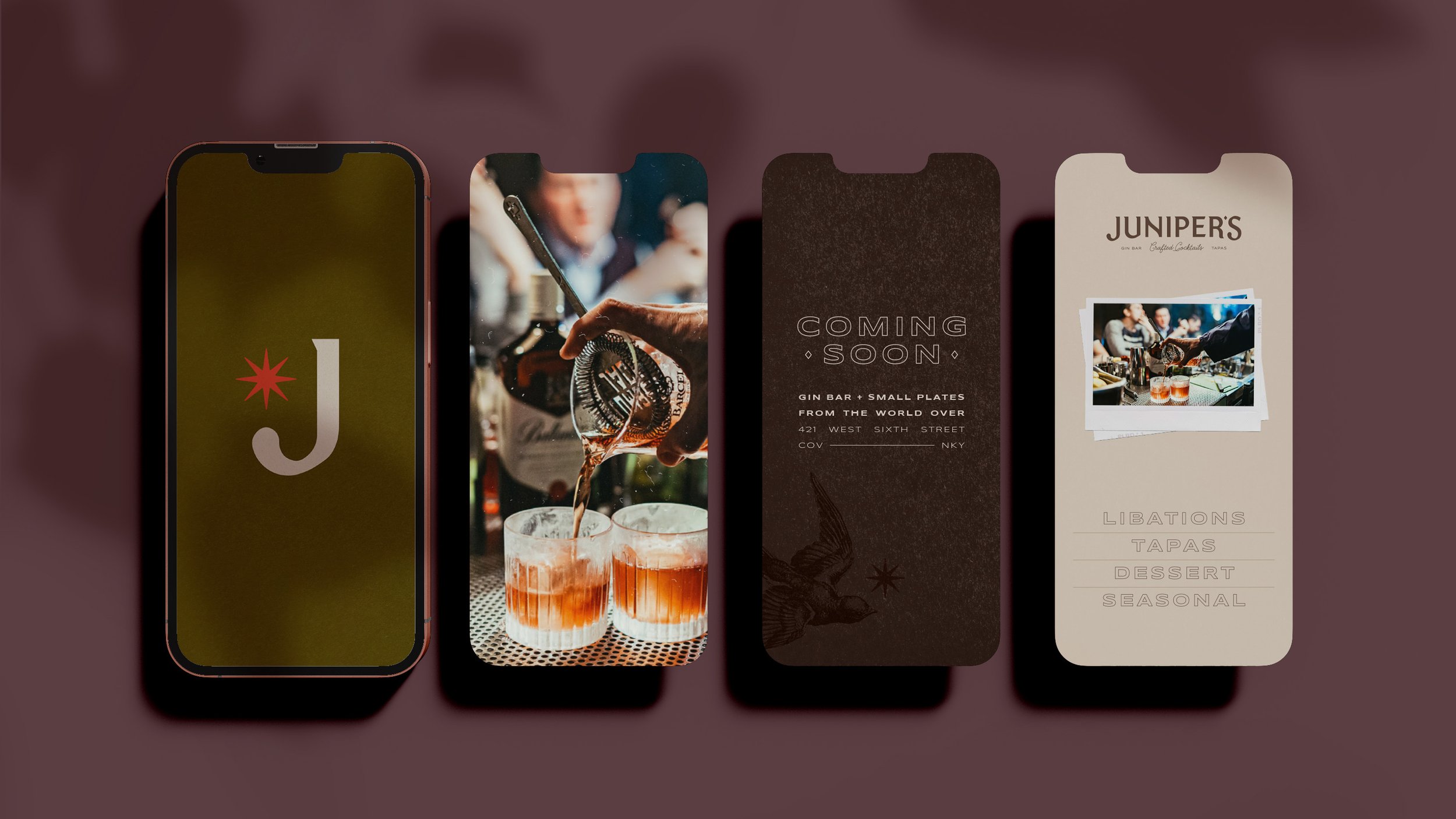 When Juniper’s approached us, they had a clear vision: a brand that felt warm, storied, and deeply connected to their community. Nestled in the heart of Northern Kentucky — surrounded by a sea of bourbon bars — Juniper’s was designed to be something different. A welcoming beacon for gin lovers, curious travelers, and anyone drawn to a life well-lived.